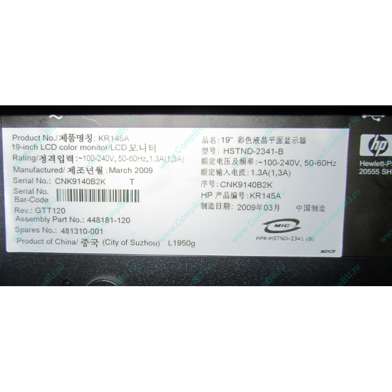 Монитор 19" HP L1950g (KR145A) 1280x1024 (5:4), assembly part number 448181-120, spares number 481310-001. Состояние очень хорошее. Есть VGA и DVI входы, 2 USB порта; монитор поднимается, наклоняется и поворачивается. Отдельно можно подвесить специальные аудио-колонки для мониторв HP.